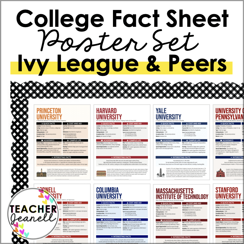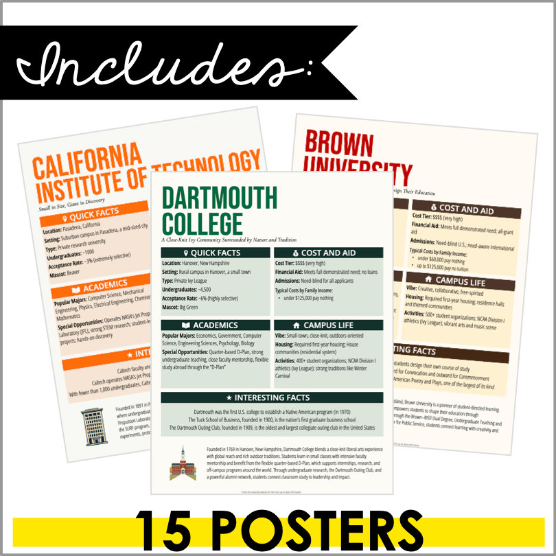 Bring college research to life with this Ivy League & Elite Peers College Fact Sheet Set. Each poster distills the essentials students most often ask about—location, setting, popular majors, campus vibe, housing, activities, cost tier, and clear financial aid notes (e.g., meets full need or no-loan policies where applicable).